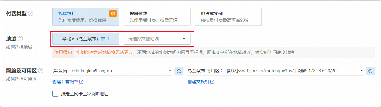 付费类型选择包年包月,地域根据需求选择,距离实例地域越近延迟越低