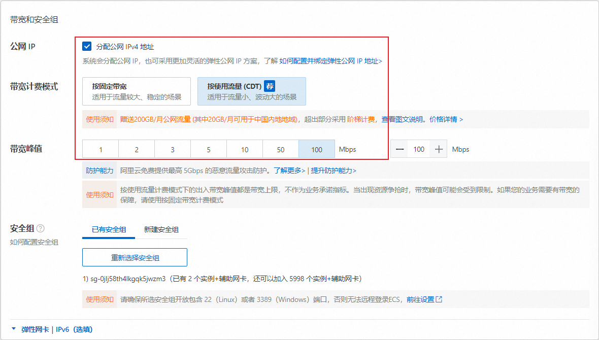 勾选分配公网IPv4地址,选择CDT计费,带宽峰值100Mbps