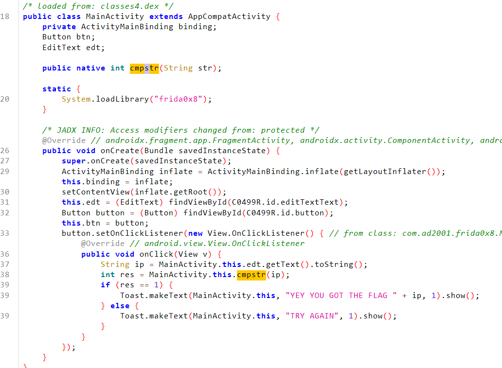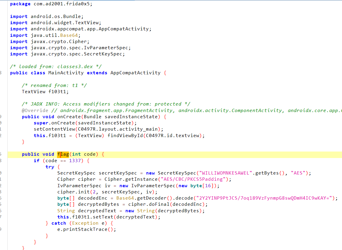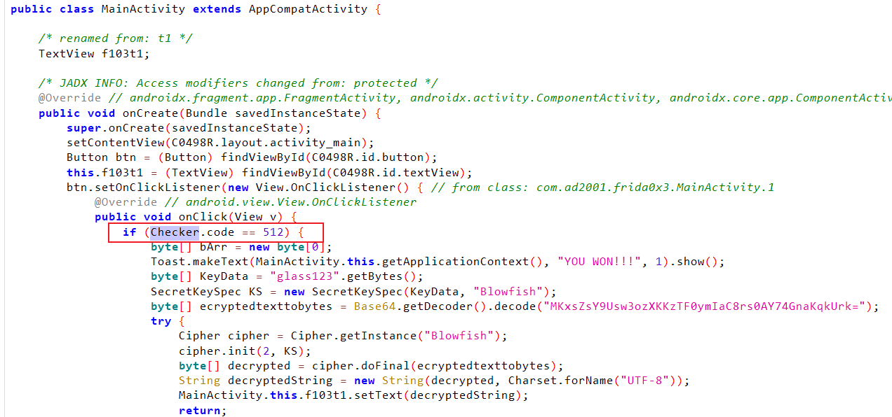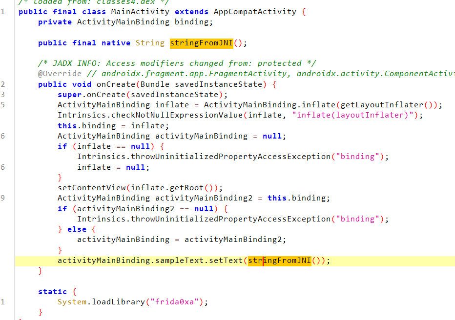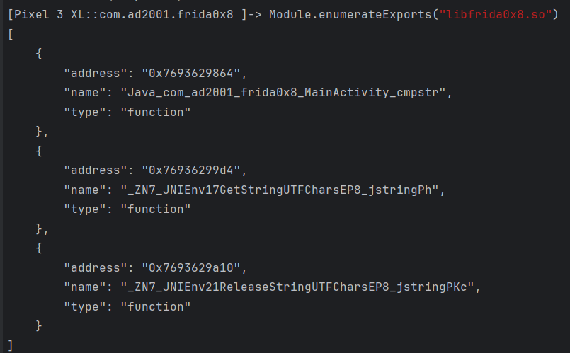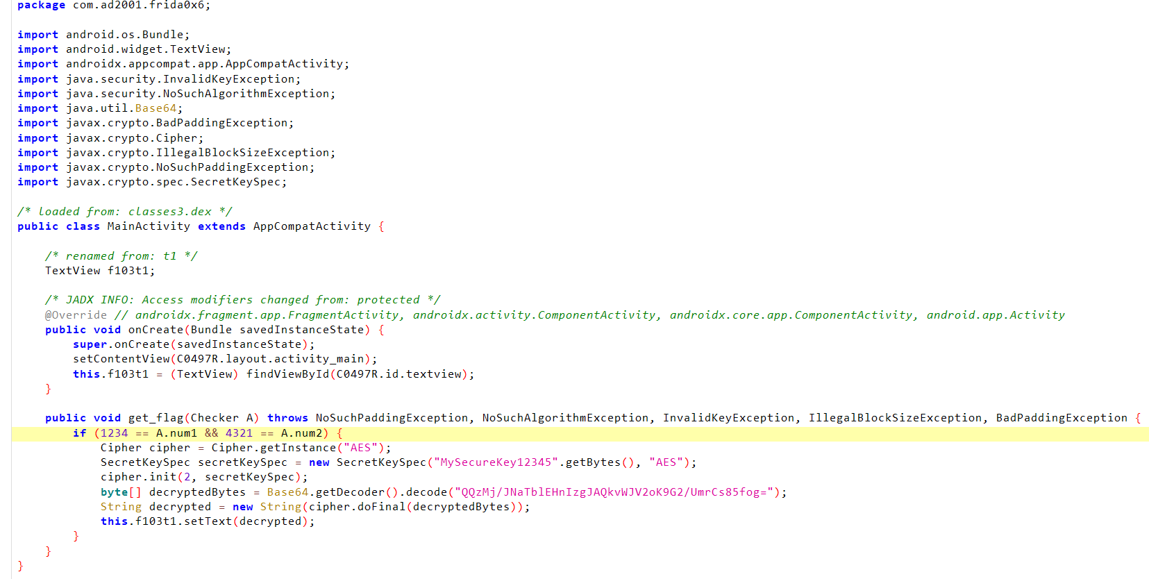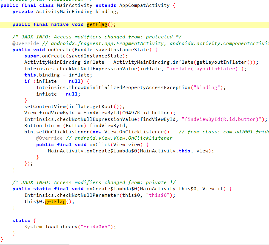 var mainActivity=Java.use("com.ad2001.frida0x1.MainActivity");